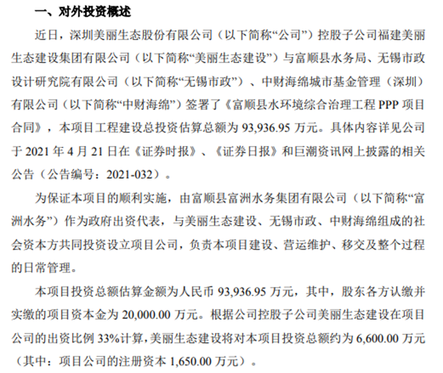 挖貝網(wǎng)5月17日,美麗生態(tài)(000010)近日發(fā)布公告,深圳美麗生態(tài)股份有限公司控股子公司福建美麗生態(tài)建設(shè)集團(tuán)有限公司與富順縣水務(wù)局、無錫市政設(shè)計(jì)研究院有限公司、中財(cái)海綿城市基金管理(深圳)有限公司簽署了《富順縣水環(huán)境綜合治理工程PPP項(xiàng)目合同》,本項(xiàng)目工程建設(shè)總投資估算總額為93,936.95萬元...