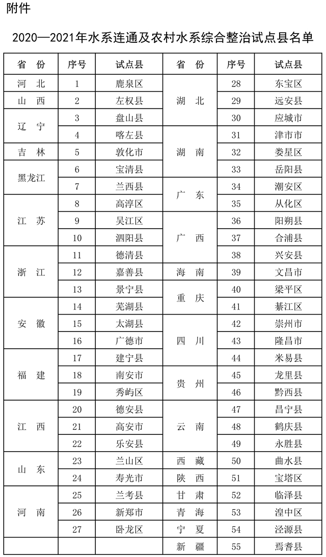 關(guān)于公布2020-2021年水系連通及農(nóng)村水系綜合整治試點(diǎn)縣名單的通知辦規(guī)計(jì)〔2020〕79號 有關(guān)省(自治區(qū)、直轄市)水利(水務(wù))廳(局)、財政廳(局): 根據(jù)《水利部 財政部關(guān)于開展水系連通及農(nóng)村水系綜合整治試點(diǎn)工作的通知》(水規(guī)計(jì)〔2019〕277號)、《水利部辦公廳關(guān)于印發(fā)水系連通及農(nóng)村水系...