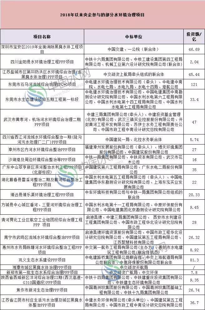 中國(guó)水網(wǎng)盤點(diǎn)2018年以來(lái)的水環(huán)境項(xiàng)目時(shí)發(fā)現(xiàn),有不少“中”字頭的央企、國(guó)企相當(dāng)活躍,而且所參與的項(xiàng)目大多是幾十億,甚至上百億的水環(huán)境治理項(xiàng)目。中國(guó)水網(wǎng)根據(jù)公開資料不完全統(tǒng)計(jì)2018年以來(lái)國(guó)企、央企參與的22個(gè)水環(huán)境治理項(xiàng)目,項(xiàng)目投資額累計(jì)約656.22億。 根據(jù)公開資料不完全...
