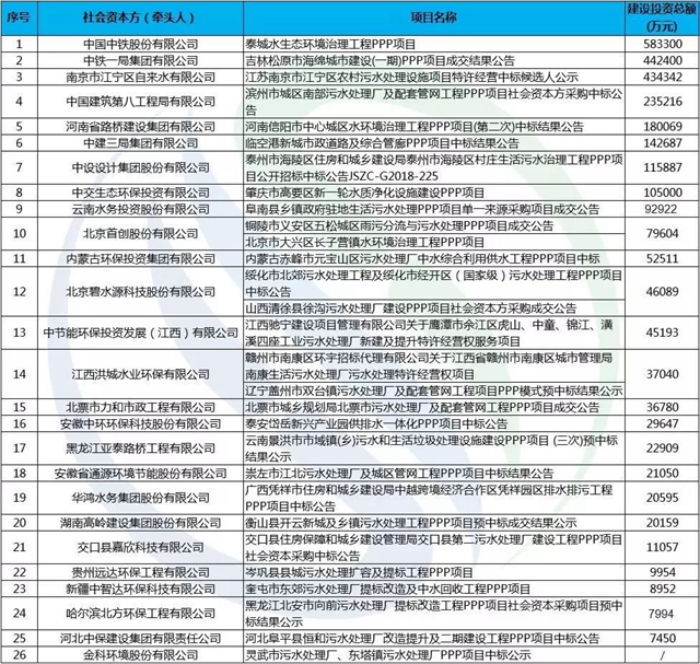 E20研究院數(shù)據(jù)中心從E標(biāo)通(信息來(lái)源:全國(guó)各級(jí)政府采購(gòu)網(wǎng)/公共資源交易平臺(tái))獲悉,2019年7月,社會(huì)資本共中標(biāo) 29個(gè)水務(wù)PPP項(xiàng)目,投資額總計(jì)超過(guò)270億元,其中,包含17個(gè)市政污水處理項(xiàng)目,4個(gè)村鎮(zhèn)污水項(xiàng)目,3個(gè)水環(huán)境項(xiàng)目,1個(gè)市政供水項(xiàng)目,3個(gè)其他項(xiàng)目。 7月水務(wù)中標(biāo)項(xiàng)目榜單如下: 注:部...