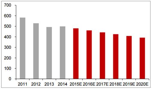環(huán)保部發(fā)布《關于推進環(huán)境污染第三方治理的實施意見》,引導工業(yè)企業(yè)進入工業(yè)園區(qū),并重點培養(yǎng)第三方處理的新模式。為工業(yè)企業(yè)提供更專業(yè)的服務。根據(jù)環(huán)保部所提供的數(shù)據(jù),2011年平均處理費用為1.26元/噸,2016年平均工業(yè)污水處理費用上升至1.6元,年均復合增長率為4.89%。由此我們估算2017年平均...