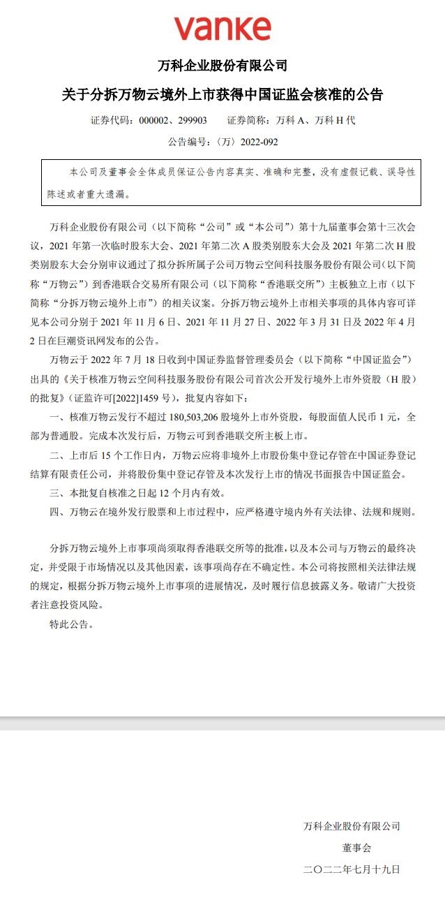 2022年7月18日晚間,萬科發(fā)布公告稱,分拆子公司萬物云空間科技服務股份有限公司到香港聯(lián)交所主板上市一事已獲中國證監(jiān)會核準。 核準萬物云發(fā)行不超過 180,503,206 股境外上市外資股,每股面值人民幣 1 元,全 部為普通股。完成本次發(fā)行后,萬物云可到香港聯(lián)交所主板上市。 據(jù)悉,萬物云一般經(jīng)營...