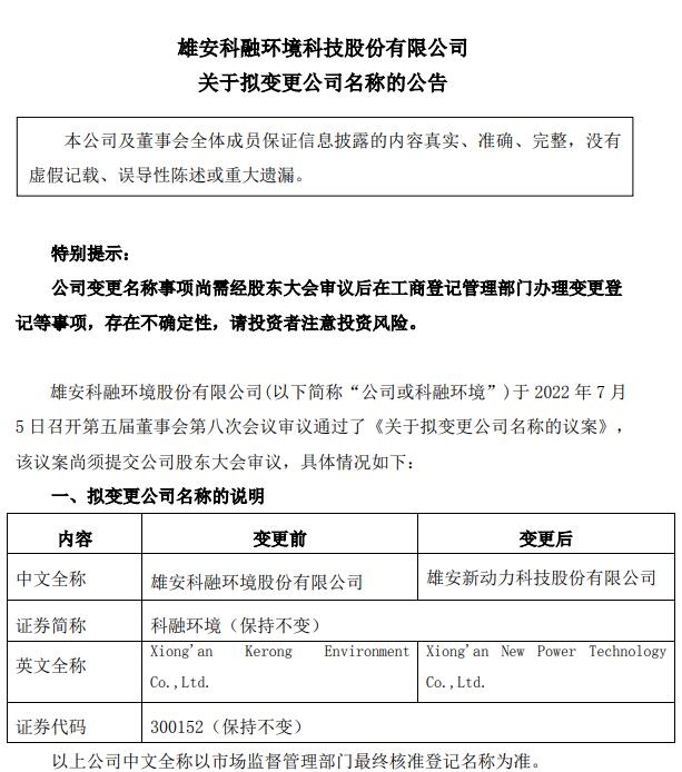 2022年7月5日,雄安科融環(huán)境科技股份有限公司發(fā)布《關于擬變更公司名稱的公告》。 科融環(huán)境擬更名為“雄安新動力科技股份有限公司”,證券簡稱不變,證券代碼不變。(公司中文全稱以市場監(jiān)督管理部門最終核準登記名稱為準) 科融環(huán)境表示,更名原因在于公司自2010年IPO以來,業(yè)務從...