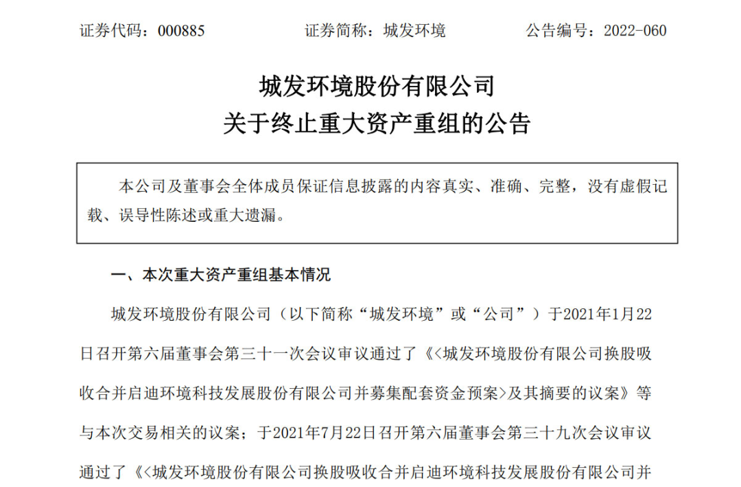 據公告顯示,終止本次重大資產重組的原因是城發(fā)環(huán)境自籌劃本次重大資產重組事項以來,嚴格按照相關法律法規(guī)的要求,與交易對方及其他相關雙方持續(xù)進行磋商與研討,并根據磋商結果積極推進相關盡職調查、審計、信息披露、內部決策等工作。鑒于本次重大重組方案論證歷時較長,相關市場環(huán)境較本次交易籌劃之初發(fā)生較大變化。經...